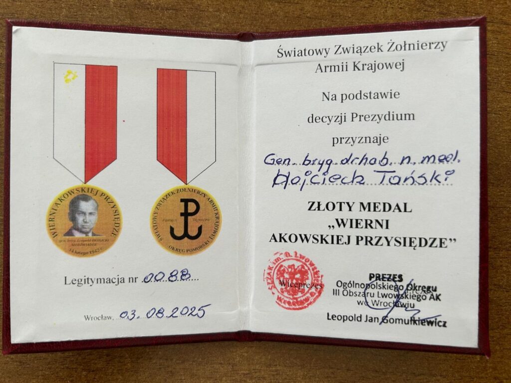 Złoty medal „Wierni Akowskiej Przysiędze” dla gen. bryg. dr. hab. n. med. Wojciecha Tańskiego.
