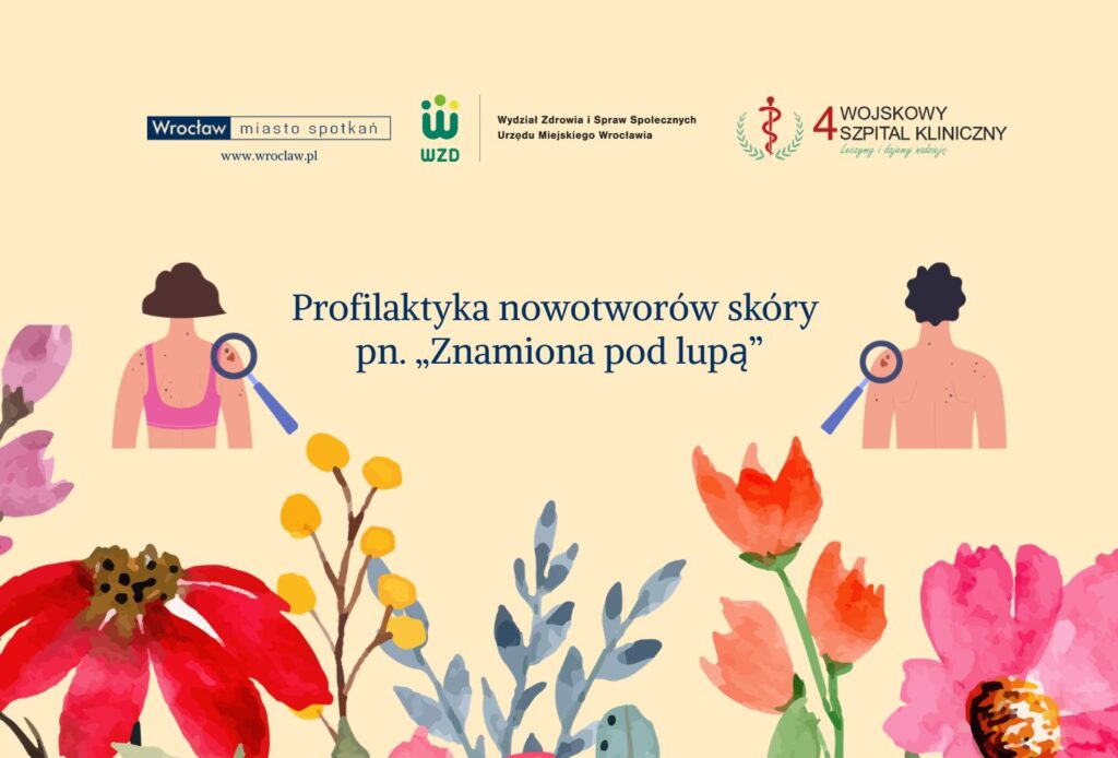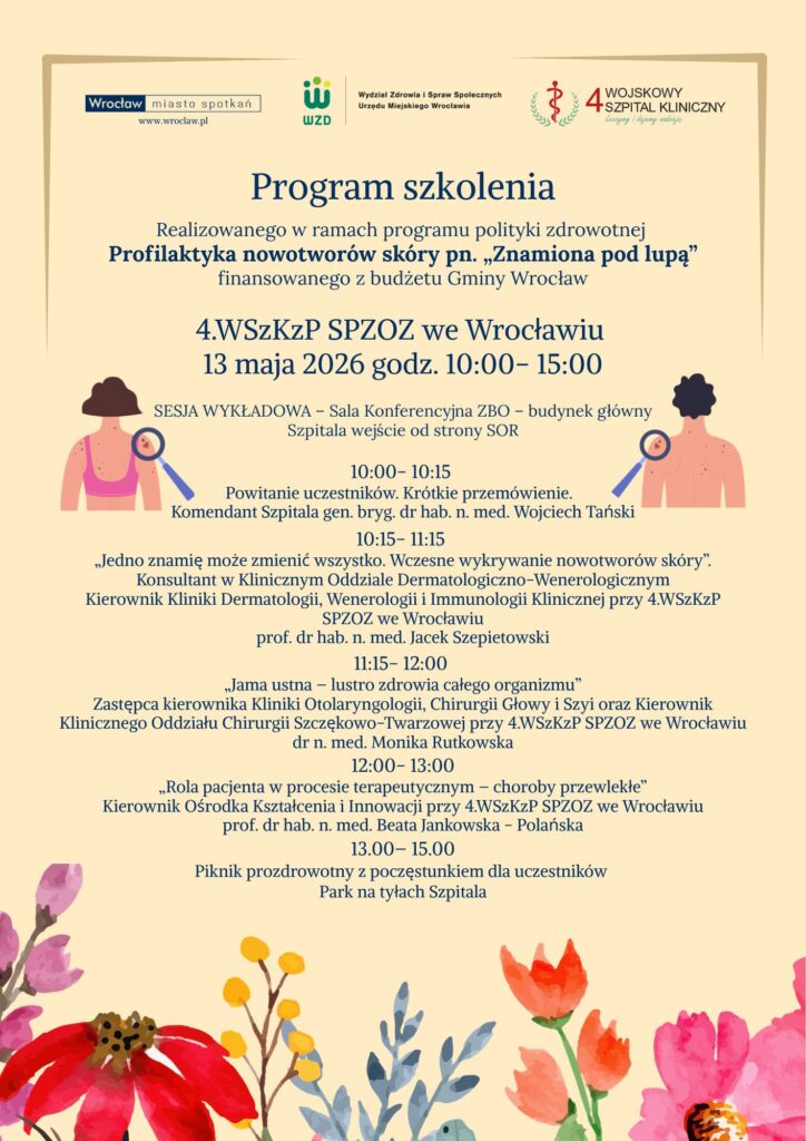 Zapraszamy na szkolenie w ramach programu polityki zdrowotnej Profilaktyka nowotworów skóry pn. „Znamiona pod lupą” finansowanego z budżetu Gminy Wrocław, które odbędzie się 13 maja 2026 r.    w godz. 10:00–15:00 w 4 Wojskowym Szpitalu Klinicznym we Wrocławiu.
